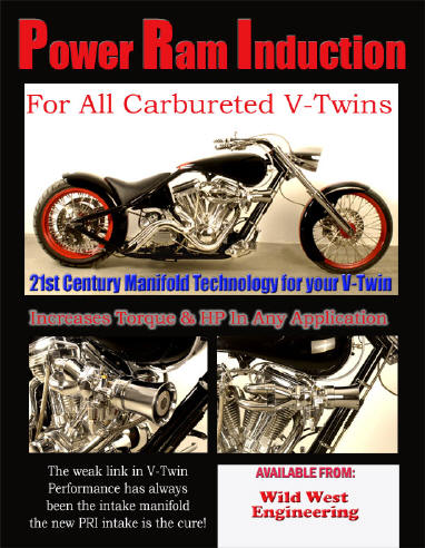 World Championship winning Drag Racer David Nickens developed the system that features individual intake runners with a common plenum to vastly increase low end torque and drivability, and a modified S&S Super G carburetor. If you have a bike that regularly runs over the 6000 RPM mark the PRI is not for you. But if your bike spends it's life in the 1500 to 5500 range as 90% of them do, then the PRI system will improve your machine's performance greatly. Increases of 20+ pound feet of torque are very common in the lower RPM range. The difference will be felt the first time you pull out of the driveway. Not only that but you can now just twist the throttle without downshifting to pass on the open road. And maybe best of all, it looks Really COOL! For more information, including dealer pricing, please contact: Wild West Engineering 43W. Plata St. Tucson, AZ. 85705 (520) 622-3889 alan@wildwestengineering.com |